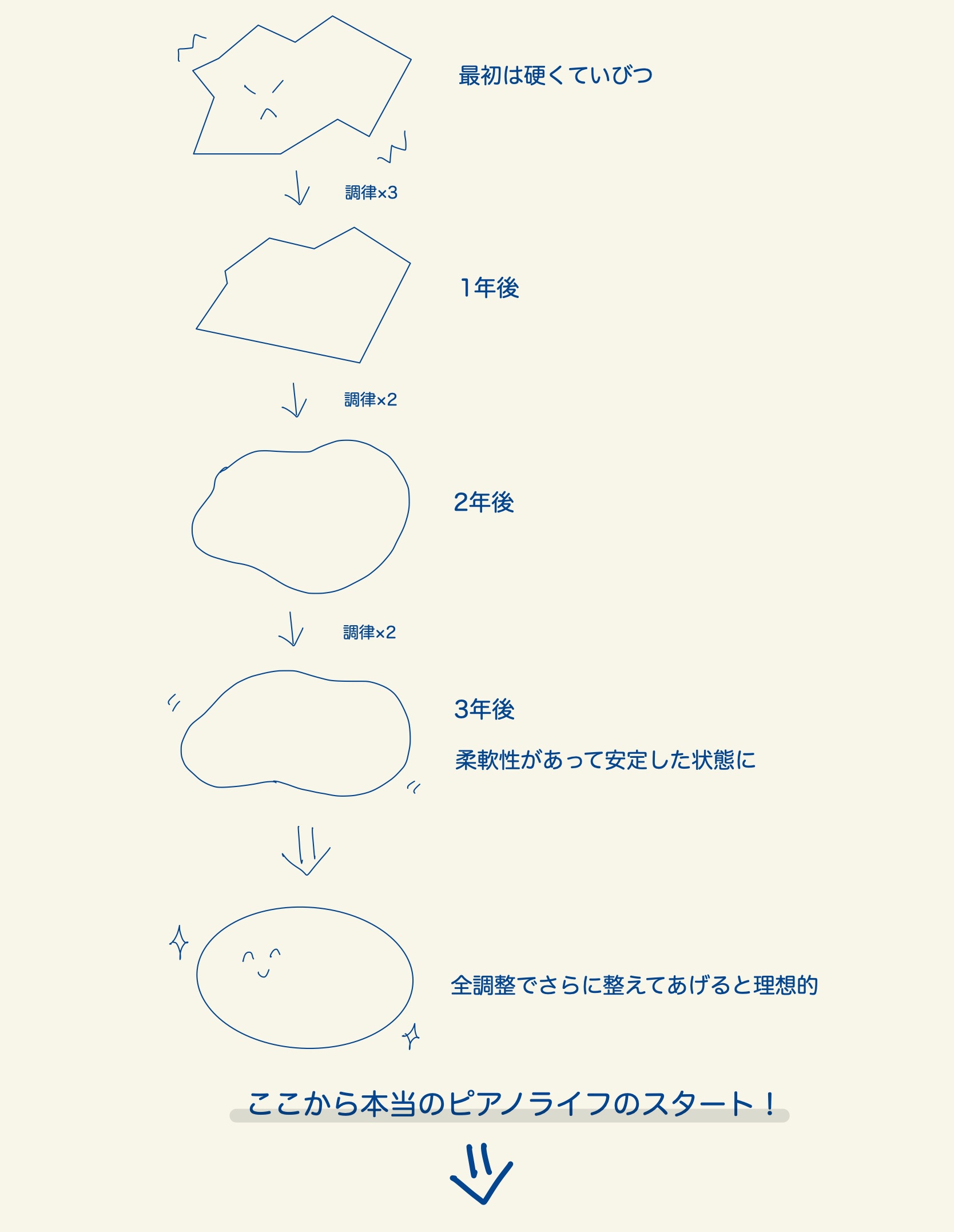 ピアノの一生を左右すると言っても過言ではない最初の3年間、気の長い話でなかなか大変だと思いますが、せっかくなのでぜひ変化を楽しみながら育ててください。