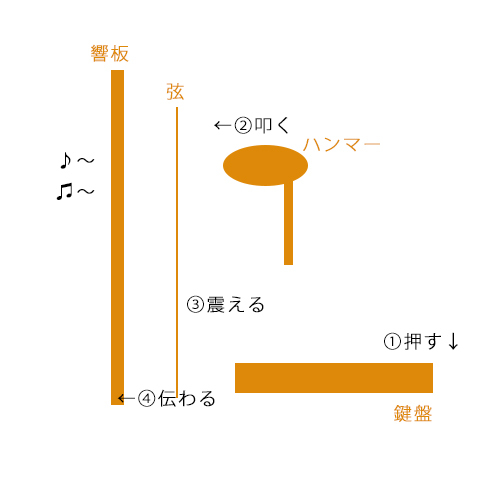 ピアノの音を出すのに重要な部品は「鍵盤」「ハンマー」「弦」「響板」の4つです。
