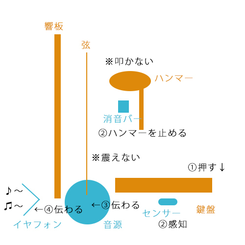 ハンマーが弦を叩かないので、ピアノ自体の音が出なくなります。