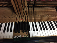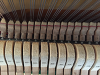 また、空き年数には関係なくこの年代のYAMAHAのアップライトピアノに多い「フレンジコード」という内部の紐が劣化により切れてしまっていたためタッチがふわふわとして連打がしづらく、バネが他の部品に当たって雑音もしています。