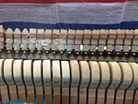 お伺いして点検すると、長期間使われていなかったようで鍵盤の下のクッションの虫喰い、金属部分のサビがあり、ネジの緩みや鍵盤のあそびも多いため、グラグラとしたタッチで非常に弾きづらくなっていました。