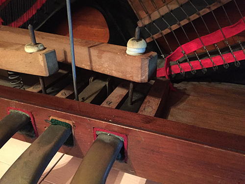 たまに出ない音があるとのことで湿気による故障を心配しましたが、原因は真ん中の弱音ペダルの調整がずれ、下がりすぎたフェルトにハンマーが引っかかっていたという軽度な症状でした。「音が出ない」という症状ひとつを取ってみてもピアノを開けてみると原因は様々です。今回のケースは一番軽度ですのでペダルの調整ですぐに直りました。
