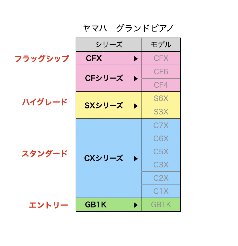 例えばヤマハのグランドピアノの全ラインナップを、シリーズごとにグレード分けするとこうなりますが、
