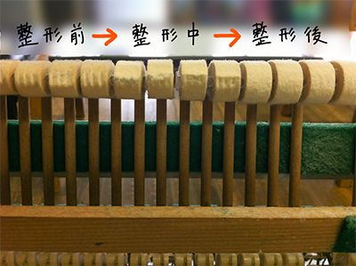 ひとつひとつハンマーを削って形を整え、担当の弦にまっすぐ当たるように角度や左右の位置も調整します。