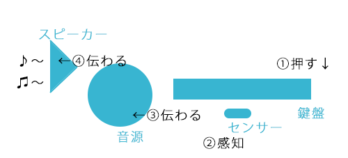「鍵盤」を押すと「センサー」が動いたことを感知し、その信号があらかじめ録音されている「音源」に伝わり「スピーカー(ヘッドフォン)」から音が出ます。
