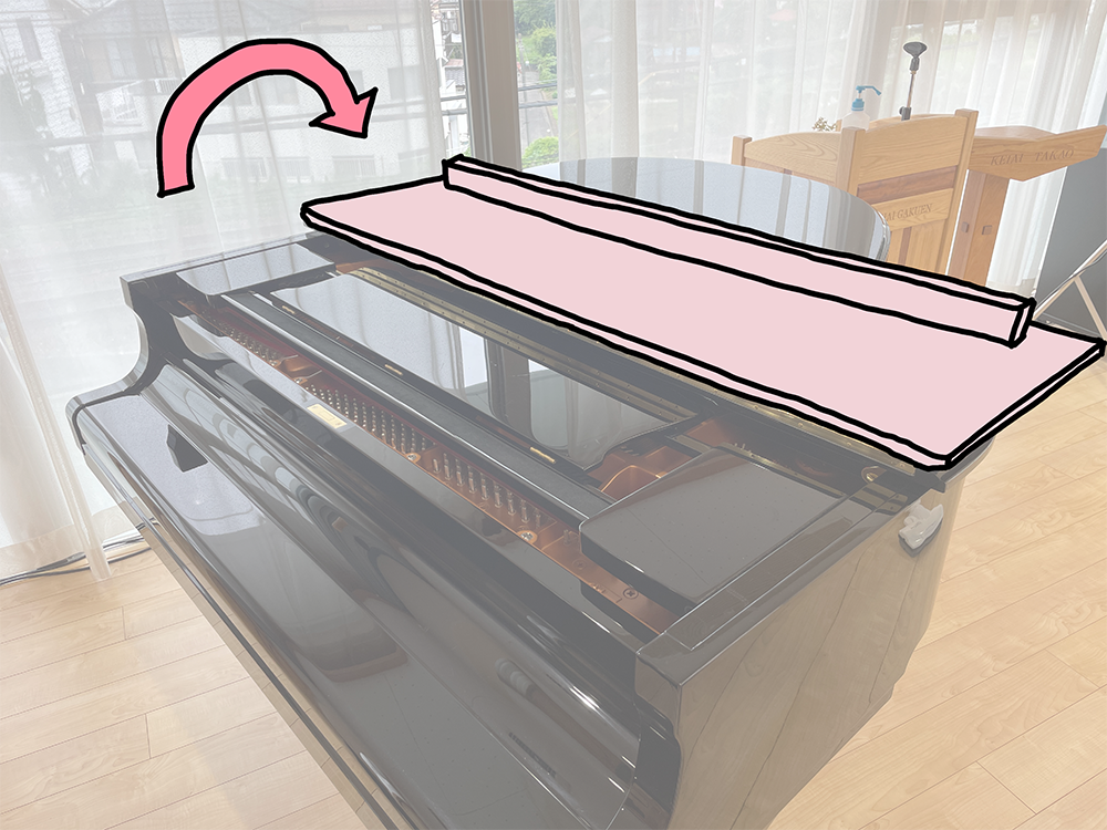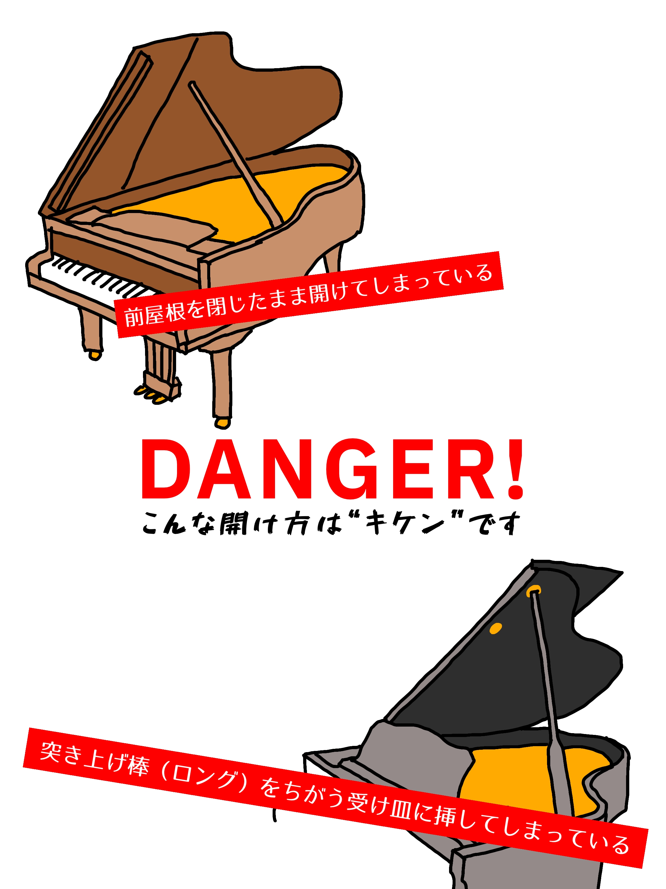 グランドピアノの大屋根の、間違った開け方の注意喚起イラストです。