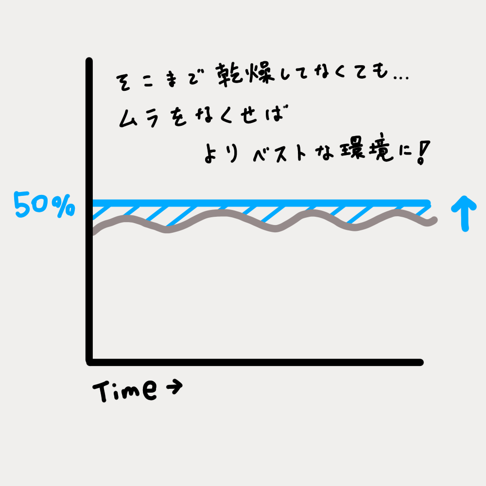 部屋干しで湿度が上がるのは一時的で、上がり具合もコントロールできません。そして乾いたときにはまた乾燥した状態に戻ってしまいます。そうなると湿度の差が大きく、一日の中で冬と梅雨が交互に来たような状態になり湿気と乾燥のダブルパンチとなってしまい逆効果です。