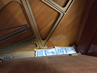 たまに出ない音があるとのことで湿気による故障を心配しましたが、原因は真ん中の弱音ペダルの調整がずれ、下がりすぎたフェルトにハンマーが引っかかっていたという軽度な症状でした。「音が出ない」という症状ひとつを取ってみてもピアノを開けてみると原因は様々です。今回のケースは一番軽度ですのでペダルの調整ですぐに直りました。